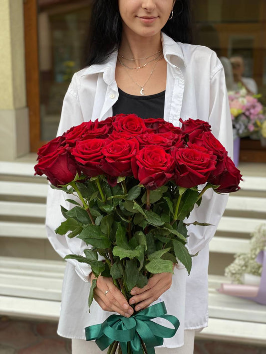 Троянди Червоні 25 шт на атласній стрічці