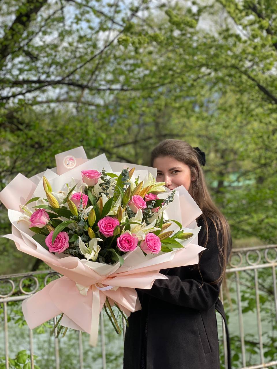 5 білих лілій 15 рожевих троянд